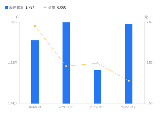 近一年(2024年6月30日至2025年6月30日),亚士创能A股股东户数从1.92万户,减低至1.79万户,降幅6.67%,区间股价上涨20.79%。