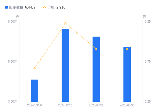 8月29日消息,数据显示,截至2025年6月30日,光大嘉宝A股股东总户数为6.44万户,较上期(2025年3月31日)减少6278户,降幅8.89%。公司最新A股总股本为15亿股,其中流通A股15亿股,户均持有流通A股数量为2.33万股,较上期增加2069.71股,增幅9.75%;户均持流通A股市值6.78万元,较上期增加6022.85元,增幅9.75%。