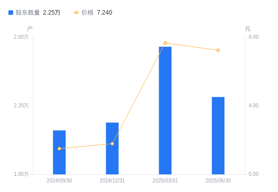 8月29日消息,数据显示,截至2025年6月30日,ST信通A股股东总户数为2.25万户,较上期(2025年3月31日)减少2931户,降幅11.52%。公司最新A股总股本为6.31亿股,其中流通A股5.66亿股,户均持有流通A股数量为2.51万股,较上期增加2894.49股,增幅13.02%;户均持流通A股市值18.2万元,较上期增加1.14万元,增幅6.68%。