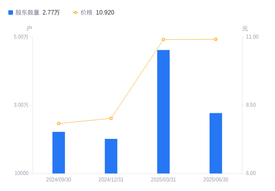8月29日消息,数据显示,截至2025年6月30日,苏豪弘业A股股东总户数为2.77万户,较上期(2025年3月31日)减少1.85万户,降幅39.99%。公司最新A股总股本为2.47亿股,其中流通A股2.47亿股,户均持有流通A股数量为8898.62股,较上期增加3558.71股,增幅66.64%;户均持流通A股市值9.72万元,较上期增加3.89万元,增幅66.80%。