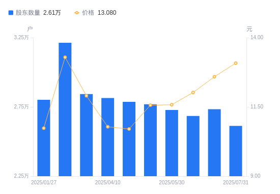 近一年(2024年8月9日至2025年7月31日),理邦仪器A股股东户数从2.57万户,增加至2.61万户,增幅1.56%,区间股价上涨58.87%。