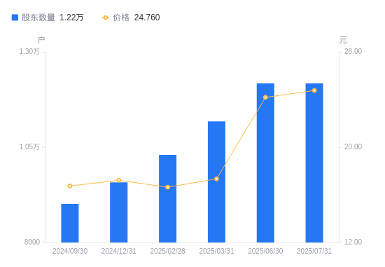 近一年(2024年9月30日至2025年7月31日),航亚科技A股股东户数从9012户,增加至1.22万户,增幅35.05%,区间股价上涨66.85%。
