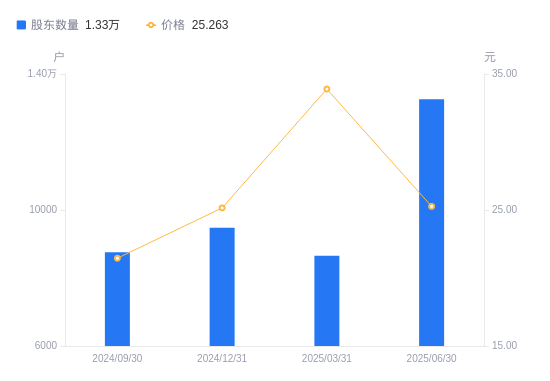 近一年(2024年6月30日至2025年6月30日),洪田股份A股股东户数从9554户,增加至1.33万户,增幅38.75%,区间股价上涨26.93%。