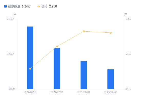8月29日消息,数据显示,截至2025年6月30日,ST东时(维权)A股股东总户数为1.24万户,较上期(2025年3月31日)减少1396户,降幅10.13%。公司最新A股总股本为7.15亿股,其中流通A股7.15亿股,户均持有流通A股数量为5.77万股,较上期增加5849.28股,增幅11.27%;户均持流通A股市值17.03万元,较上期增加1.41万元,增幅9.06%。