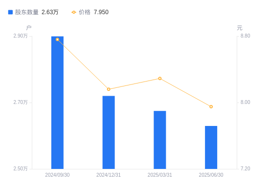 近一年(2024年6月30日至2025年6月30日),基蛋生物A股股东户数从2.87万户,减低至2.63万户,降幅8.50%,区间股价上涨4.88%。