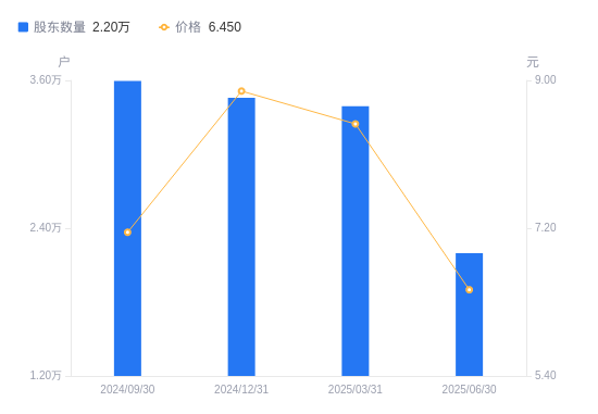 近一年(2024年6月30日至2025年6月30日),*ST海源A股股东户数从3.31万户,减低至2.2万户,降幅33.60%,区间股价上涨25.00%。