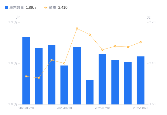 近一年(2024年8月30日至2025年8月20日),ST长方A股股东户数从2.17万户,减低至1.89万户,降幅12.74%,区间股价上涨89.76%。