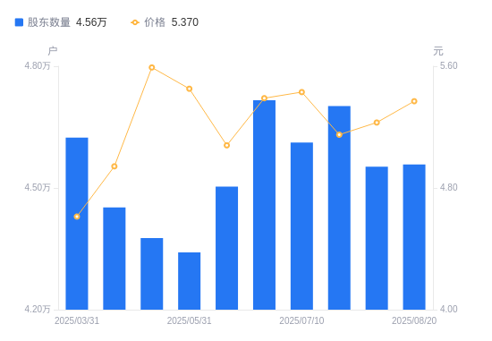 近一年(2024年8月20日至2025年8月20日),华锦股份A股股东户数从5.17万户,减低至4.56万户,降幅11.90%,区间股价上涨32.53%。