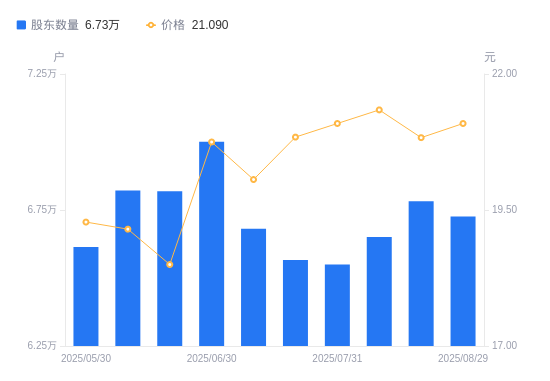 近一年(2024年8月30日至2025年8月29日),航发控制A股股东户数从5.78万户,增加至6.73万户,增幅16.29%,区间股价上涨14.45%。