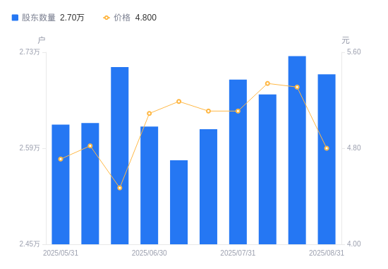 近一年(2024年9月20日至2025年8月31日),华斯股份A股股东户数从2.94万户,减低至2.7万户,降幅8.17%,区间股价上涨60.54%。