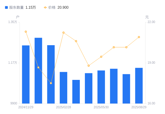 近一年(2024年8月30日至2025年8月29日),田中精机A股股东户数从1.96万户,减低至1.15万户,降幅41.32%,区间股价上涨9.83%。