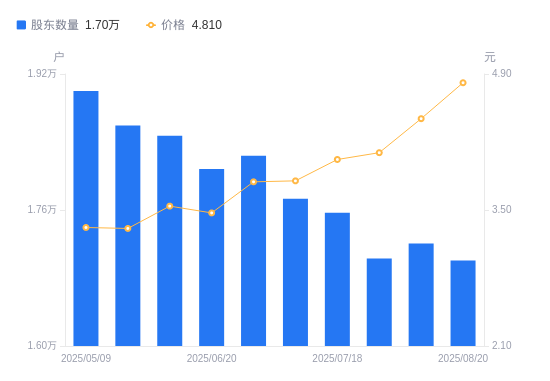 近一年(2024年9月10日至2025年8月20日),ST天瑞A股股东户数从2.89万户,减低至1.7万户,降幅41.19%,区间股价上涨87.16%。
