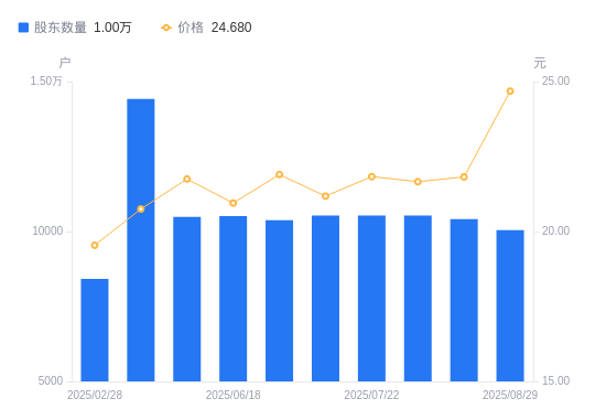 近一年(2024年9月30日至2025年8月29日),海川智能A股股东户数从9135户,增加至1万户,增幅9.96%,区间股价上涨80.81%。