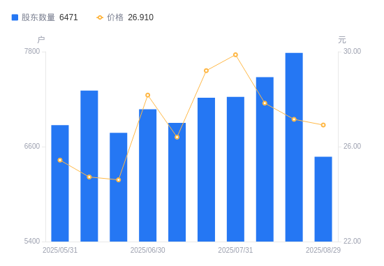 近一年(2024年9月20日至2025年8月29日),实朴检测A股股东户数从1.33万户,减低至6471户,降幅51.33%,区间股价上涨169.10%。