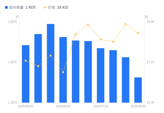 近一年(2024年8月30日至2025年8月29日),英可瑞A股股东户数从2.16万户,减低至1.45万户,降幅32.98%,区间股价上涨36.98%。