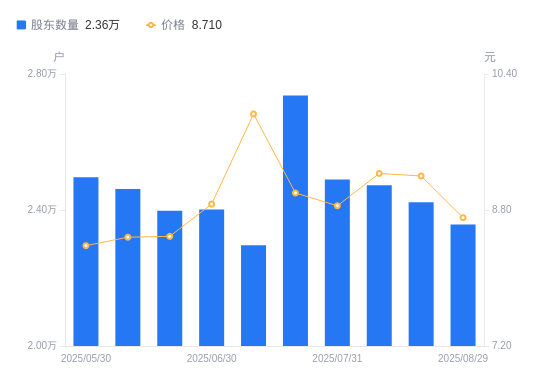 近一年(2024年8月30日至2025年8月29日),英力特A股股东户数从2.6万户,减低至2.36万户,降幅9.37%,区间股价上涨48.13%。