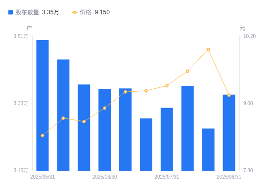 近一年(2024年9月10日至2025年8月31日),大连电瓷A股股东户数从3.72万户,减低至3.35万户,降幅9.78%,区间股价上涨15.43%。