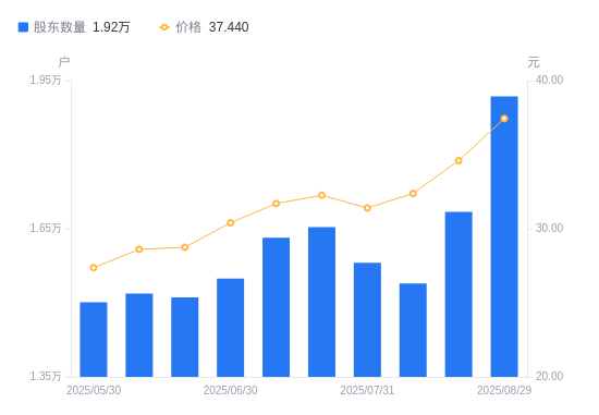 近一年(2024年8月30日至2025年8月29日),秋田微A股股东户数从1.87万户,增加至1.92万户,增幅2.52%,区间股价上涨42.87%。