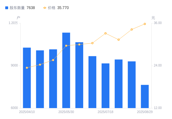 近一年(2024年8月30日至2025年8月29日),江苏博云A股股东户数从7807户,减低至7638户,降幅2.16%,区间股价上涨105.40%。