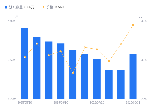 近一年(2024年9月30日至2025年8月31日),云维股份A股股东户数从3.15万户,增加至3.66万户,增幅16.50%,区间股价上涨37.98%。