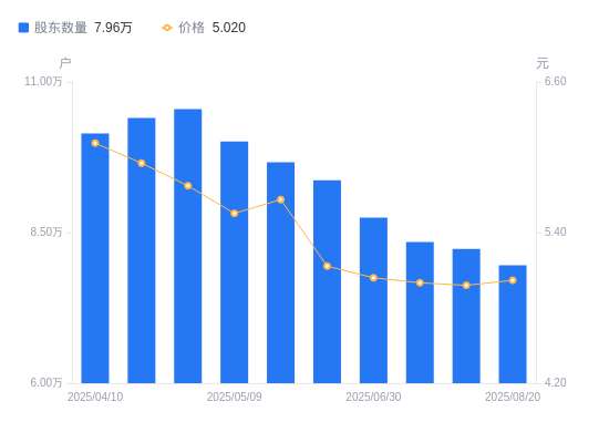 近一年(2024年8月20日至2025年8月20日),广安爱众A股股东户数从5.68万户,增加至7.96万户,增幅40.15%,区间股价上涨59.72%。