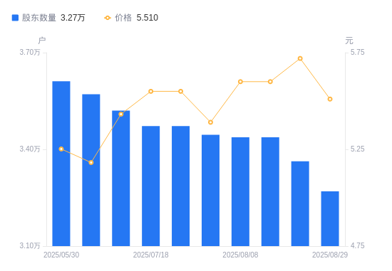 近一年(2024年9月30日至2025年8月29日),鹏鹞环保A股股东户数从3.52万户,减低至3.27万户,降幅7.15%,区间股价上涨22.94%。