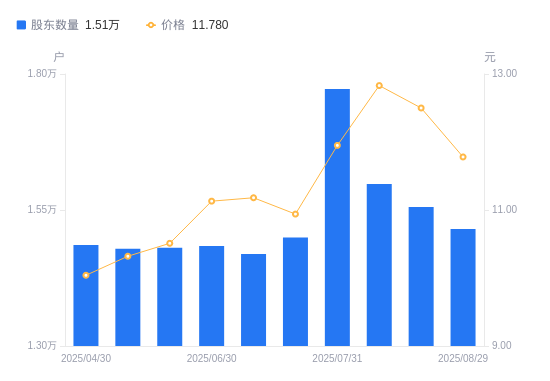 近一年(2024年8月30日至2025年8月29日),宇新股份A股股东户数从1.32万户,增加至1.51万户,增幅14.55%,区间股价上涨4.99%。