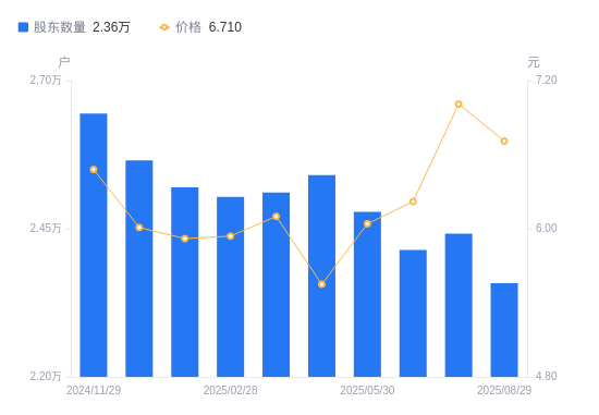 近一年(2024年9月30日至2025年8月29日),汉森制药A股股东户数从2.69万户,减低至2.36万户,降幅12.36%,区间股价上涨18.55%。
