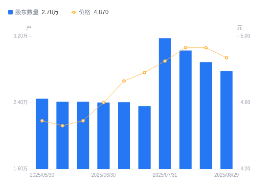近一年(2024年9月30日至2025年8月29日),龙泉股份A股股东户数从2.81万户,减低至2.78万户,降幅1.24%,区间股价上涨28.16%。