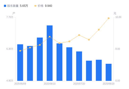 近一年(2024年8月30日至2025年8月29日),中原内配A股股东户数从5.13万户,增加至5.42万户,增幅5.66%,区间股价上涨102.86%。