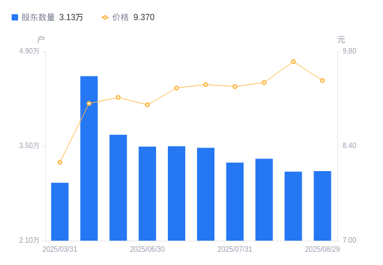 近一年(2024年9月30日至2025年8月29日),三态股份A股股东户数从2.71万户,增加至3.13万户,增幅15.59%,区间股价上涨14.41%。