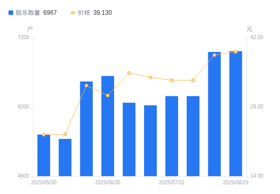 近一年(2024年8月30日至2025年8月29日),金橙子A股股东户数从4773户,增加至6967户,增幅45.97%,区间股价上涨154.99%。