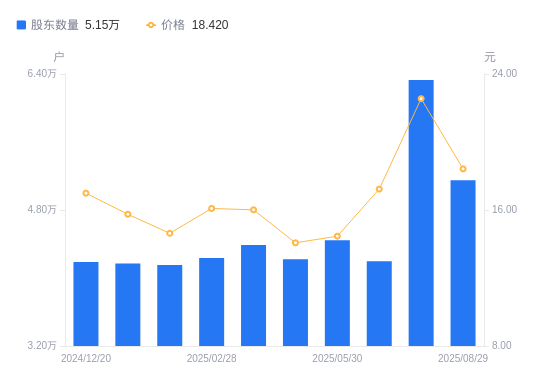 近一年(2024年9月30日至2025年8月29日),中远海科A股股东户数从4.36万户,增加至5.15万户,增幅18.24%,区间股价上涨15.63%。