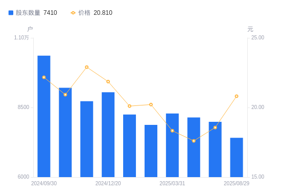 近一年(2024年8月30日至2025年8月29日),美新科技A股股东户数从1.43万户,减低至7410户,降幅48.28%,区间股价上涨12.49%。