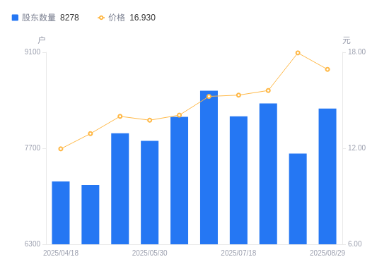 近一年(2024年9月30日至2025年8月29日),名雕股份A股股东户数从8142户,增加至8278户,增幅1.67%,区间股价上涨60.41%。