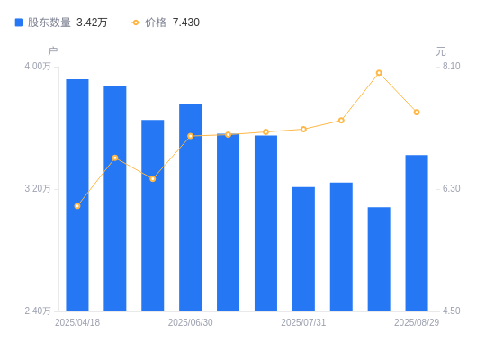近一年(2024年9月20日至2025年8月29日),罗平锌电A股股东户数从3.44万户,减低至3.42万户,降幅0.48%,区间股价上涨55.11%。