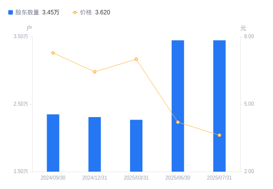近一年(2024年9月30日至2025年7月31日),*ST金泰A股股东户数从2.35万户,增加至3.45万户,增幅46.75%,区间股价下跌44.14%。