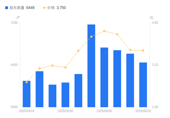 近一年(2024年9月20日至2025年8月29日),ST雪发A股股东户数从5968户,增加至6449户,增幅8.06%,区间股价上涨32.04%。