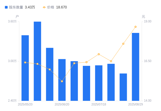 近一年(2024年8月30日至2025年8月29日),通达动力A股股东户数从3.34万户,增加至3.43万户,增幅2.79%,区间股价上涨65.37%。