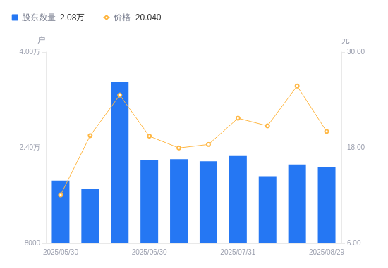 9月5日消息,数据显示,截至2025年8月29日,易明医药A股股东总户数为2.08万户,较上期(2025年8月20日)减少397户,降幅1.87%。公司最新A股总股本为1.91亿股,其中流通A股1.74亿股,户均持有流通A股数量为8381.08股,较上期增加156.97股,增幅1.91%;户均持流通A股市值16.8万元,较上期减少4.37万元,降幅20.66%。