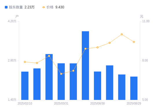 近一年(2024年9月10日至2025年8月29日),麦趣尔A股股东户数从2.5万户,减低至2.23万户,降幅10.83%,区间股价上涨64.00%。