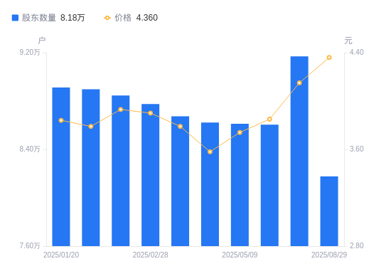 近一年(2024年9月10日至2025年8月29日),泰达股份A股股东户数从9.2万户,减低至8.18万户,降幅11.07%,区间股价上涨42.95%。