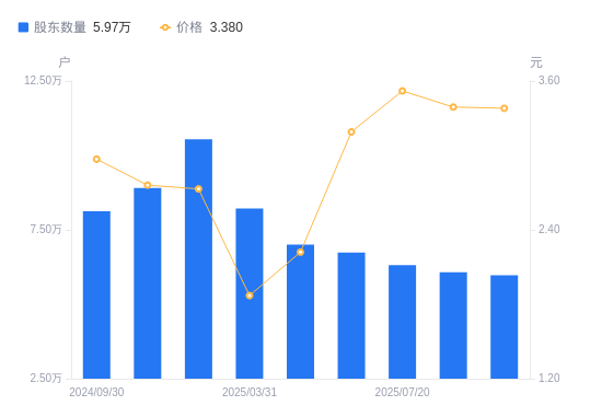 近一年(2024年9月30日至2025年8月29日),*ST新研A股股东户数从8.13万户,减低至5.97万户,降幅26.55%,区间股价上涨33.07%。