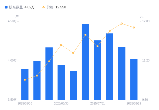 近一年(2024年8月30日至2025年8月29日),东港股份A股股东户数从2.64万户,增加至4.02万户,增幅52.13%,区间股价上涨101.77%。