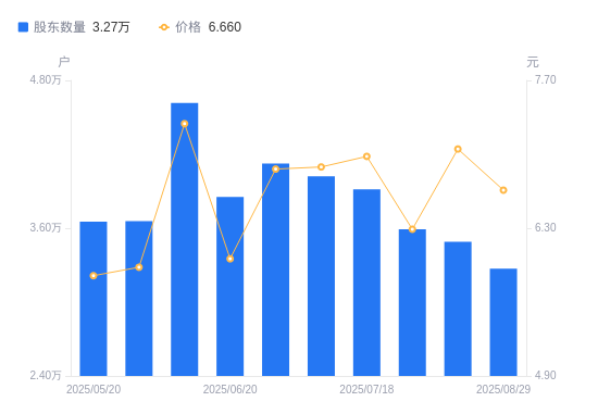 近一年(2024年8月30日至2025年8月29日),红相股份A股股东户数从1.31万户,增加至3.27万户,增幅149.51%,区间股价上涨59.33%。