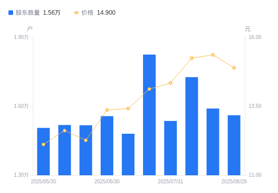 近一年(2024年9月10日至2025年8月29日),欣天科技A股股东户数从1.76万户,减低至1.56万户,降幅11.15%,区间股价上涨55.21%。