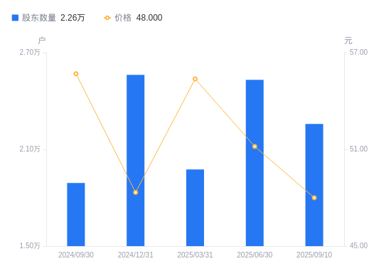 近一年(2024年9月30日至2025年9月10日),航天电器A股股东户数从1.89万户,增加至2.26万户,增幅19.31%,区间股价下跌5.16%。