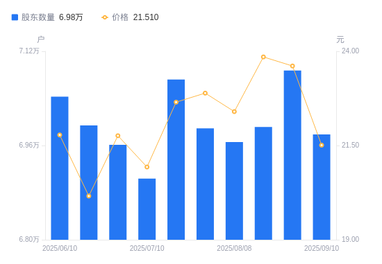 近一年(2024年9月10日至2025年9月10日),易华录A股股东户数从6.56万户,增加至6.98万户,增幅6.37%,区间股价上涨50.42%。