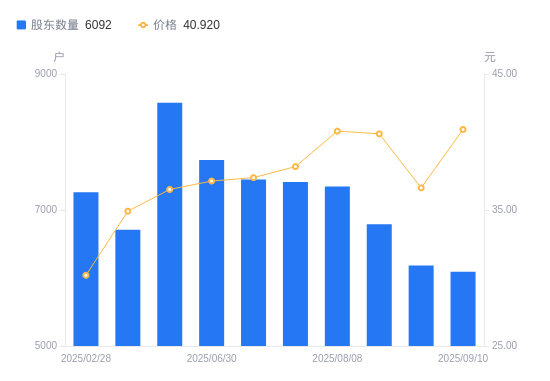 近一年(2024年9月20日至2025年9月10日),鸿铭股份A股股东户数从8071户,减低至6092户,降幅24.52%,区间股价上涨77.99%。