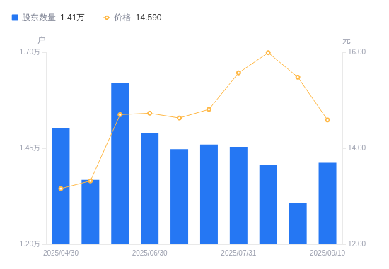 近一年(2024年9月30日至2025年9月10日),万祥科技A股股东户数从1.55万户,减低至1.41万户,降幅8.91%,区间股价上涨5.88%。